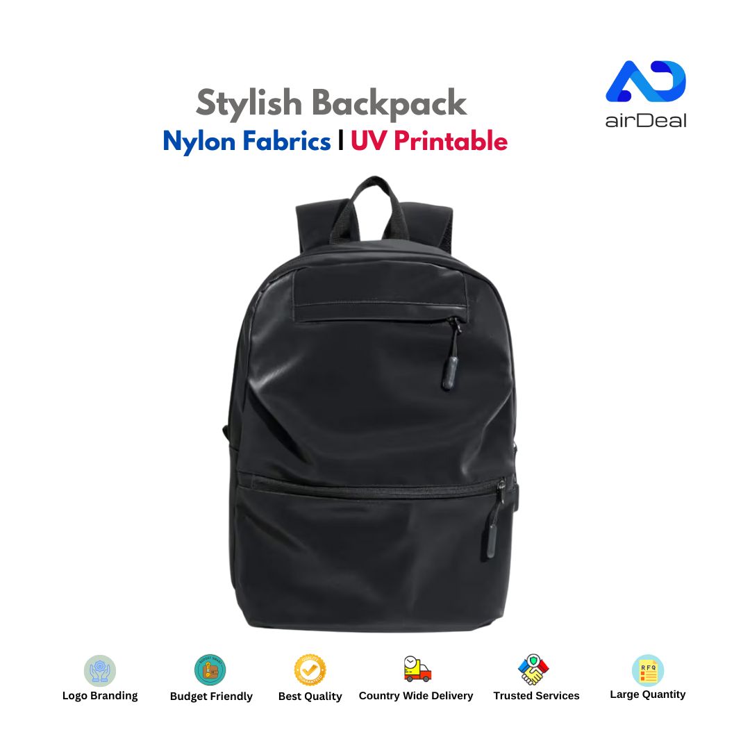 • Perfect for corporate branding, school & college students • Made from durable Oxford Polyester, softback design • 3 compartments: 1 main chambers + 2 front pocket +2 Side pocket • Fits up to 15.6″ laptops, 20L storage capacity • Moderate water resistance, zipper closure • Soft handle & ergonomic back support for comfort • Color: Classic black, ideal for printing logos • Dimension: 18″H × 13″W × 5″D