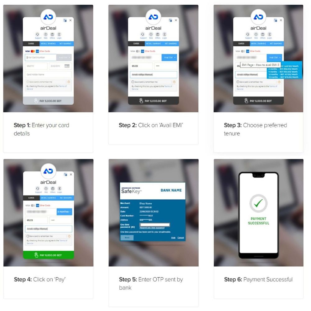 EMI তে অর্থ পরিশোধ প্রদান করতে চাইলে পেমেন্ট অপশন হিসেবে "SSL Commerz" সিলেক্ট করুন এবং আপনার অর্ডার সম্পুর্ন করুন। অর্ডারটি সম্পুর্ন করার পর EMI পেমেন্ট অপশন টি একটিভ হবে। অতঃপর নিচের চিত্রে প্রদর্শিত প্রক্রিয়াটি অনুসরণ করুন:
